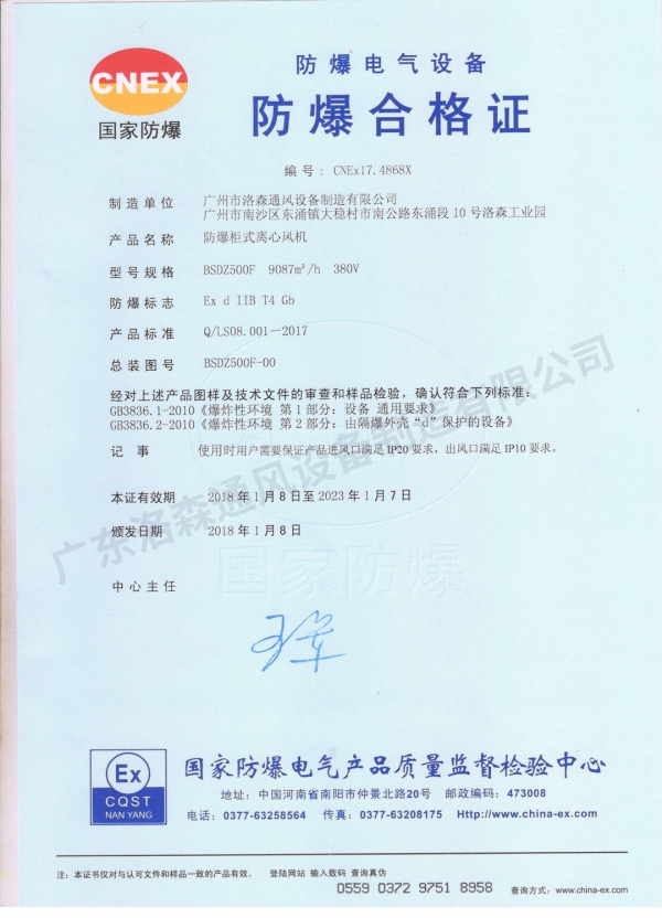 主页 > 荣誉资质 > 产品认证证书 > 防爆合格证-防爆柜式离心风机BSDZ500F
