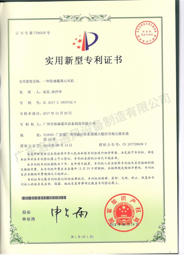 主页 > 荣誉资质 > 专利证书 > 一种防渗漏离心风机